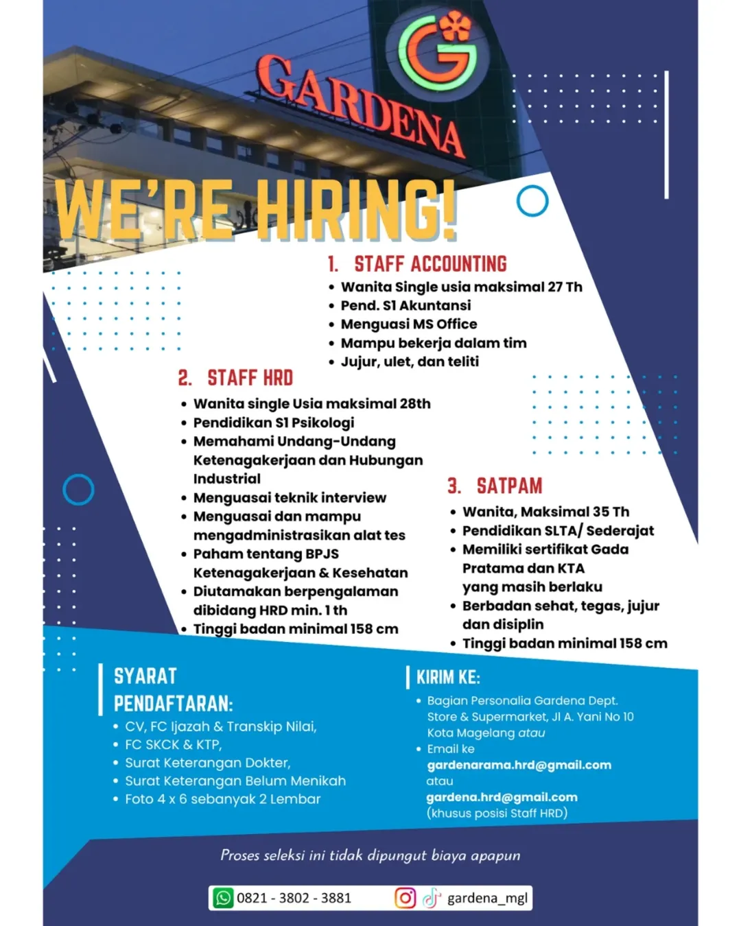 Proses seleksi ini tidak dipungut biaya apapun. Untuk informasi lebih lanjut, pelamar dapat menghubungi WhatsApp di nomor 0821-3802-3881 atau mengunjungi akun media sosial Gardena di TikTok dan Instagram: @gardena_mgl.