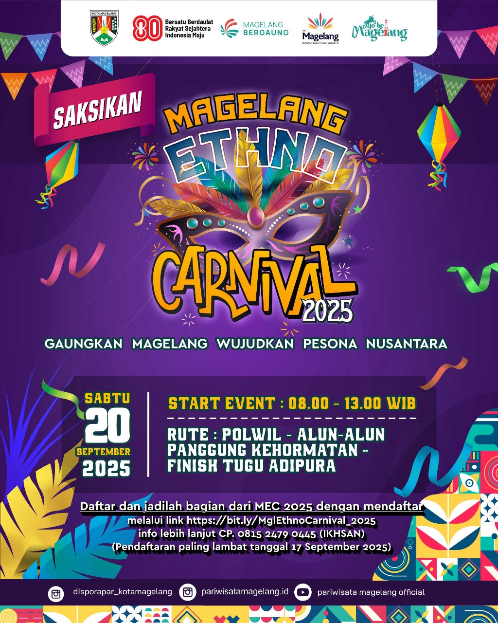 Magelang Ethno Carnival 2025 Siap Digelar 20 September Usai Sempat Tertunda Karena Demo magelangnewsSeptember 8, 2025September 8, 2025 Halaman: 1 2 Pos terkaitTak Disangka! Bakso Yuti dari Karet Magelang Sajikan Hidangan untuk PresidenPresiden Prabowo Subianto Resmikan Pabrik Kendaraan Listrik VKTR di MagelangJenazah Serka (Anm) Muhammad Nur Ichwan Tiba di Rumah Duka, Akan Dimakamkan di TMP Giriloyo MagelangRumah Duka Sertu Ichwan Dipenuhi Karangan Bunga, Tamu Terus Berdatangan dari Berbagai InstansiPrajurit Asal Magelang, Sertu Ichwan Gugur dalam Misi UNIFIL di LebanonBertambah Dua Personel TNI Gugur dalam Ledakan di Lebanon, Total Tiga Prajurit UNIFIL
