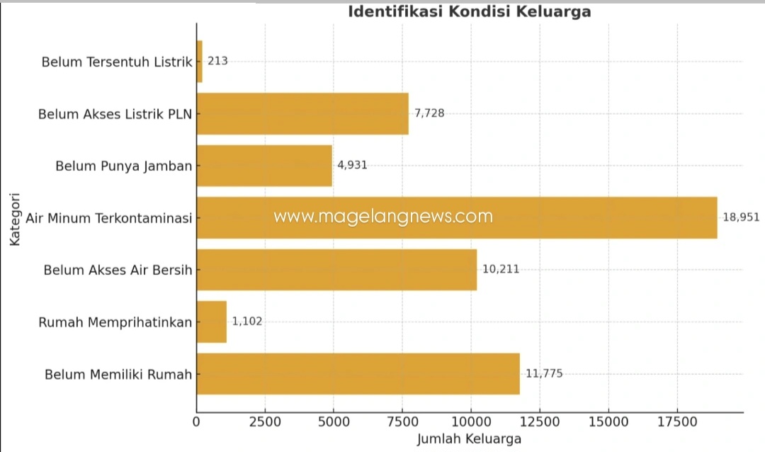 Berdasarkan hasil pendataan, diperoleh identifikasi bahwa masih ada tantangan serius di Kabupaten Magelang. Sebanyak 11.775 keluarga belum memiliki rumah, 1.102 keluarga tinggal di rumah dengan kondisi memprihatinkan, 10.211 keluarga belum memiliki akses air bersih, dan 18.951 keluarga menggunakan sumber air minum yang diduga terkontaminasi limbah. Selain itu, 4.931 keluarga belum memiliki fasilitas jamban, 7.728 keluarga belum terhubung listrik PLN, bahkan 213 keluarga sama sekali belum tersentuh listrik.