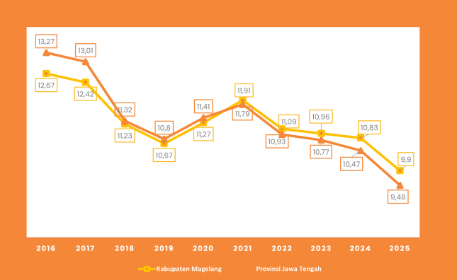 MAGELANG – Badan Pusat Statistik (BPS) Kabupaten Magelang merilis data terbaru kemiskinan tahun 2025. Berdasarkan hasil Survei Sosial Ekonomi Nasional (Susenas), persentase penduduk miskin di Kabupaten Magelang turun menjadi 9,9 persen, menurun 0,93 persen poin dibanding tahun 2024 yang mencapai 10,83 persen.
