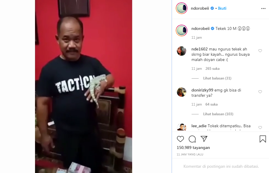 MagelangNews.com – Setelah Viral video jual beli tokek seharga 10 miliar di sebuah akun Instagram yang bernama @ndorobeii sempat sontak membuat nitizen berkomentar pro dan kontra video tersebut diunggah sekitar 11 jam yang lalu yang telah mendapatkan 1.745 komentar dan 150.989 tayangan